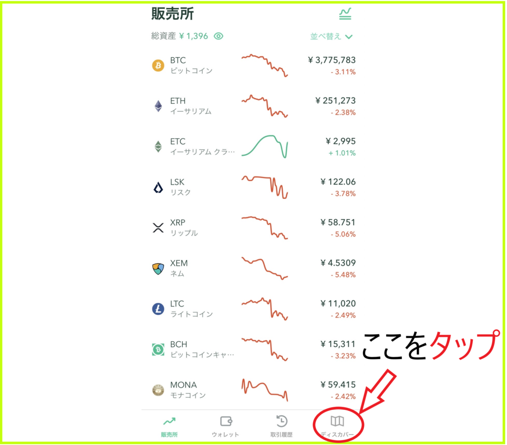 ①コインチェックのアプリを開いて画面右下の【ディスカバー】をタップします。
